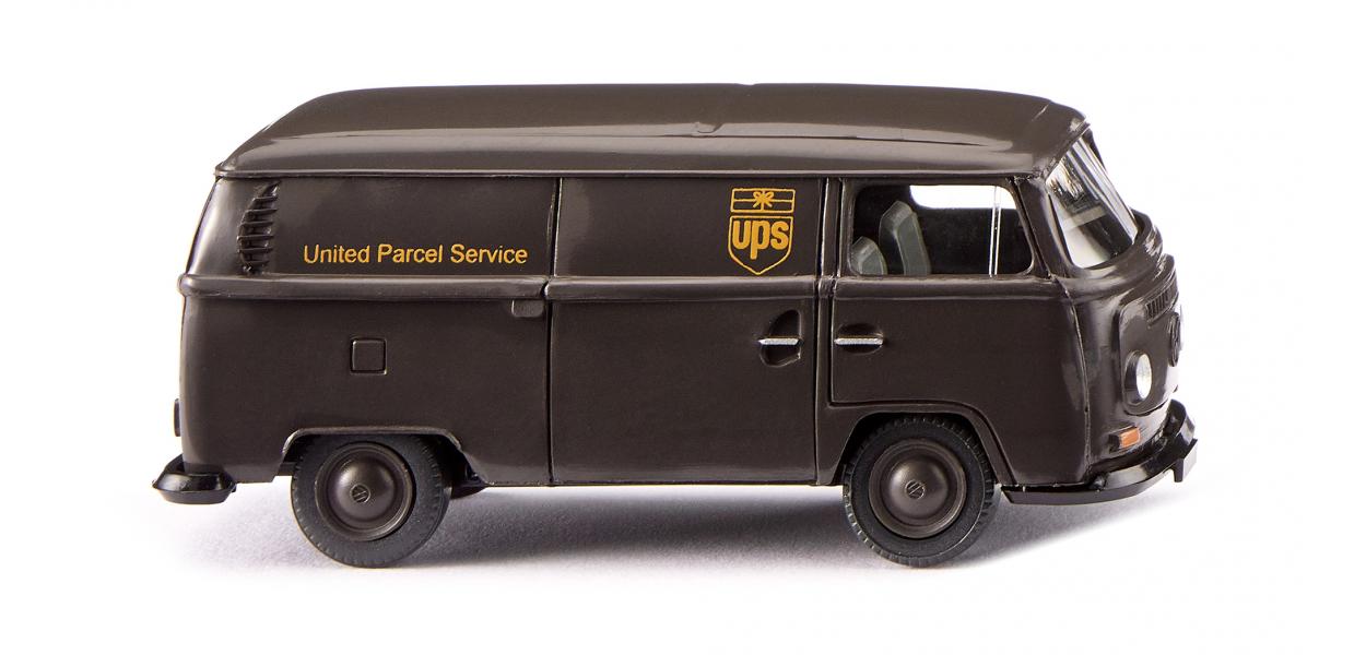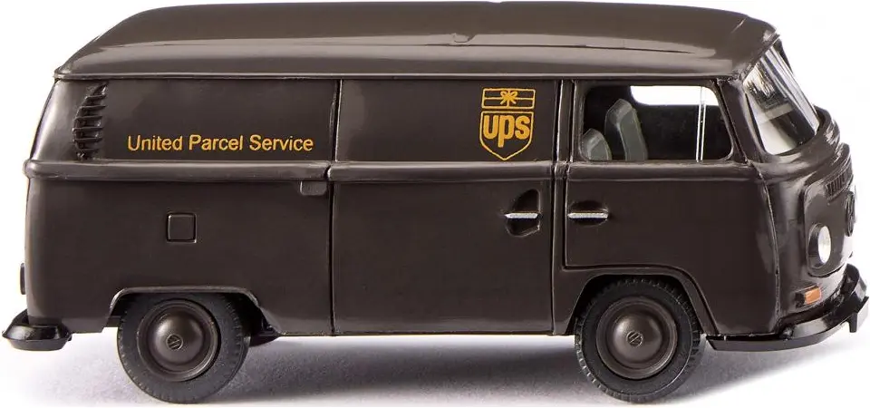 Erst der VW T1, nun auch sein Nachfolger – UPS setzte einst auf den robusten Transporter aus Niedersachsen. Während in Deutschland die Postzustellung noch lange Jahre eine hoheitliche Aufgabe war und der Deutschen Bundespost zufiel, hatten in den USA die Paketzusteller längst privatisierte Strukturen. United Parcel Service setzte schon in den fünfziger Jahren auf den VW T1 (Typ 2) und ließ 1967 auch die zweite Generation folgen. Der dunkelbraune Kastenwagen, den WIKING miniaturisiert, trug bereits die goldenen Lettern von UPS.