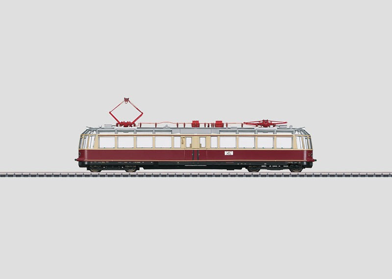 Vorbild: Elektrischer Aussichtstriebwagen Baureihe ET 91 „Gläserner Zug“ der Deutschen Bundesbahn (DB). Farbgebung purpurrot/beige. Mit Einfachlampen an den Stirnseiten, mit Luftpfeife auf dem Dach statt Makrophon, ohne Zugbahnfunk, mit 2 Scheren-Stromabnehmern. Betriebszustand um 1965.